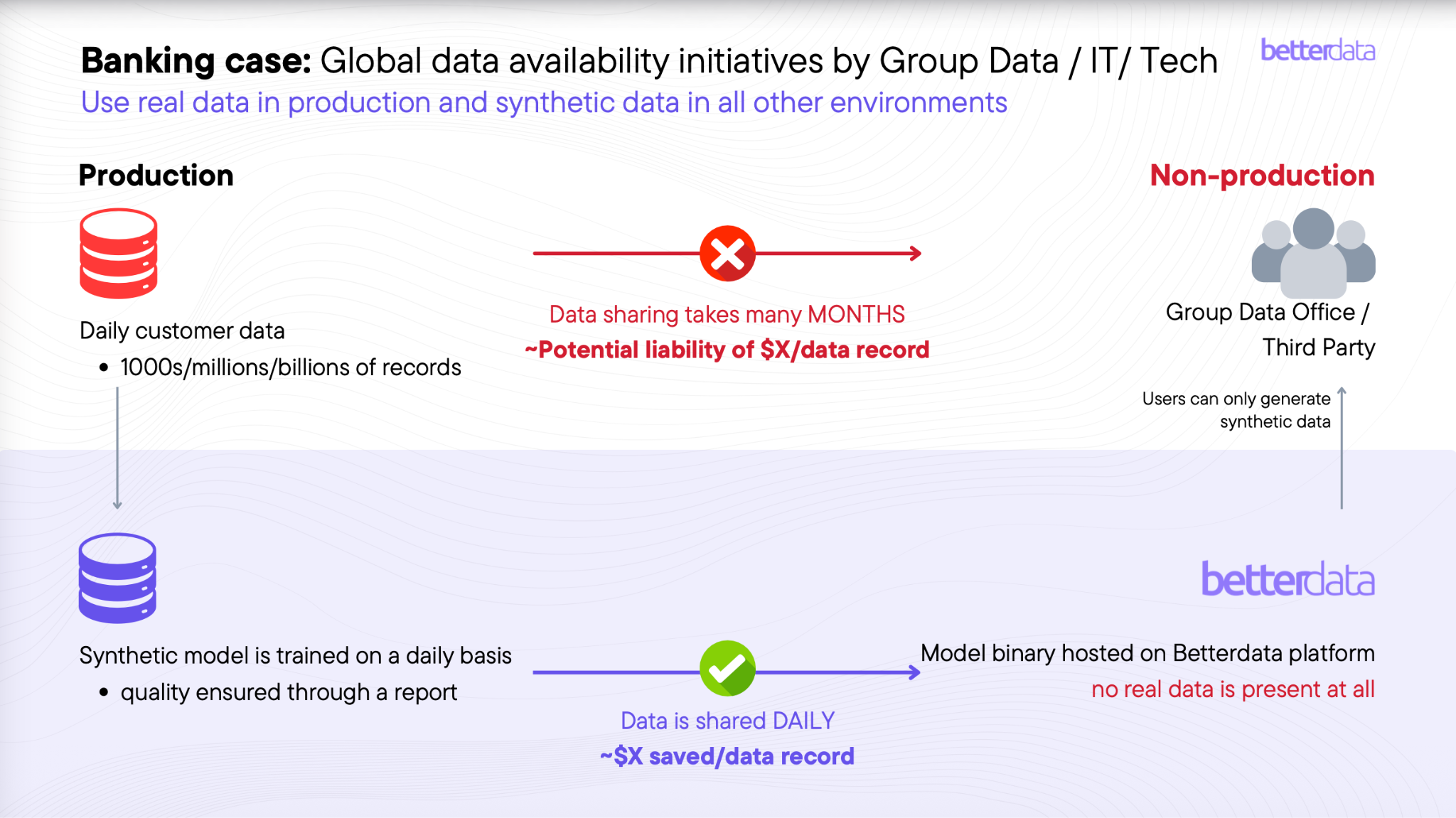 In many banking environments, data sharing for development or analytics can take months, while operational systems process millions or billions of records daily.