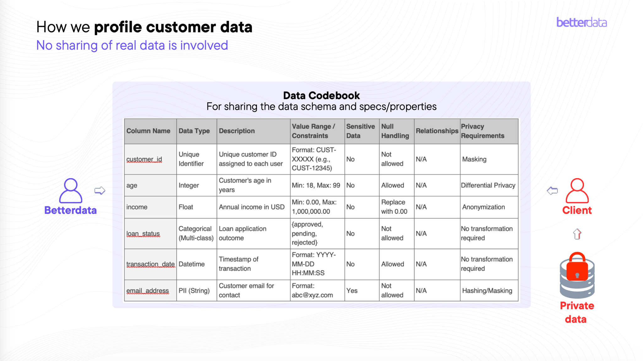 Instead of transferring datasets, the platform uses a data codebook that describes the structure and constraints of the original dataset.